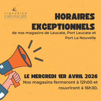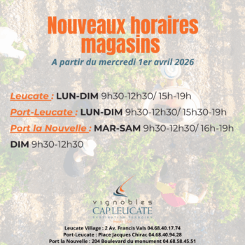 Nouveaux horaires à partir du 1er avril 2026 Vos magasins des Vignobles Cap Leucate ajustent leurs horaires pour mieux vous…